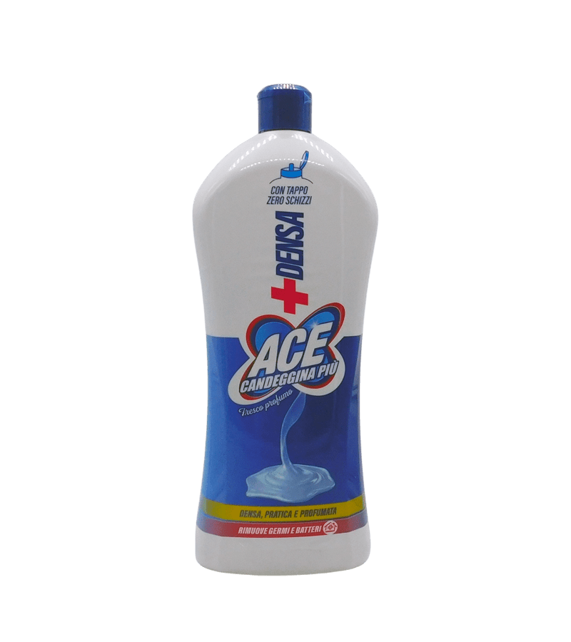 ACE Densa Candeggina Più mit frischem Duft. Dichte und spritzfreie Formel mit hygienischer Wirkung zur Entfernung von Keimen und Bakterien. Ideal für die Reinigung von Wäsche und Oberflächen.