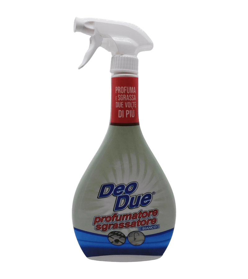 Der weiße Deo Due Profumatore Sgrassatore bietet intensive Reinigungskraft und einen frischen Duft. Ideal für Küche und Bad.