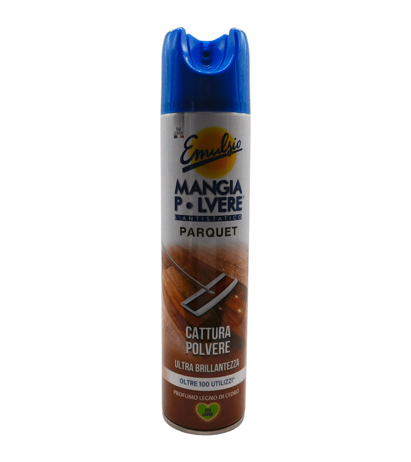 Emulsio Mangia Polvere Parquet ist ein antistatischer Staubfänger, speziell entwickelt für Holzböden. Entfernt Staub effektiv, schützt die Oberfläche und hinterlässt einen frischen Duft nach Zedernholz. Ideal für die tägliche Reinigung mit über 100 Anwendungen pro Dose.