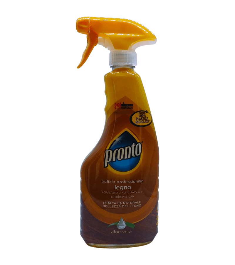 Holzpflegespray mit Aloe Vera von Pronto. Professionelle Reinigung für Holzoberflächen. Hergestellt aus 100% recyceltem Kunststoff. Betont die natürliche Schönheit des Holzes.